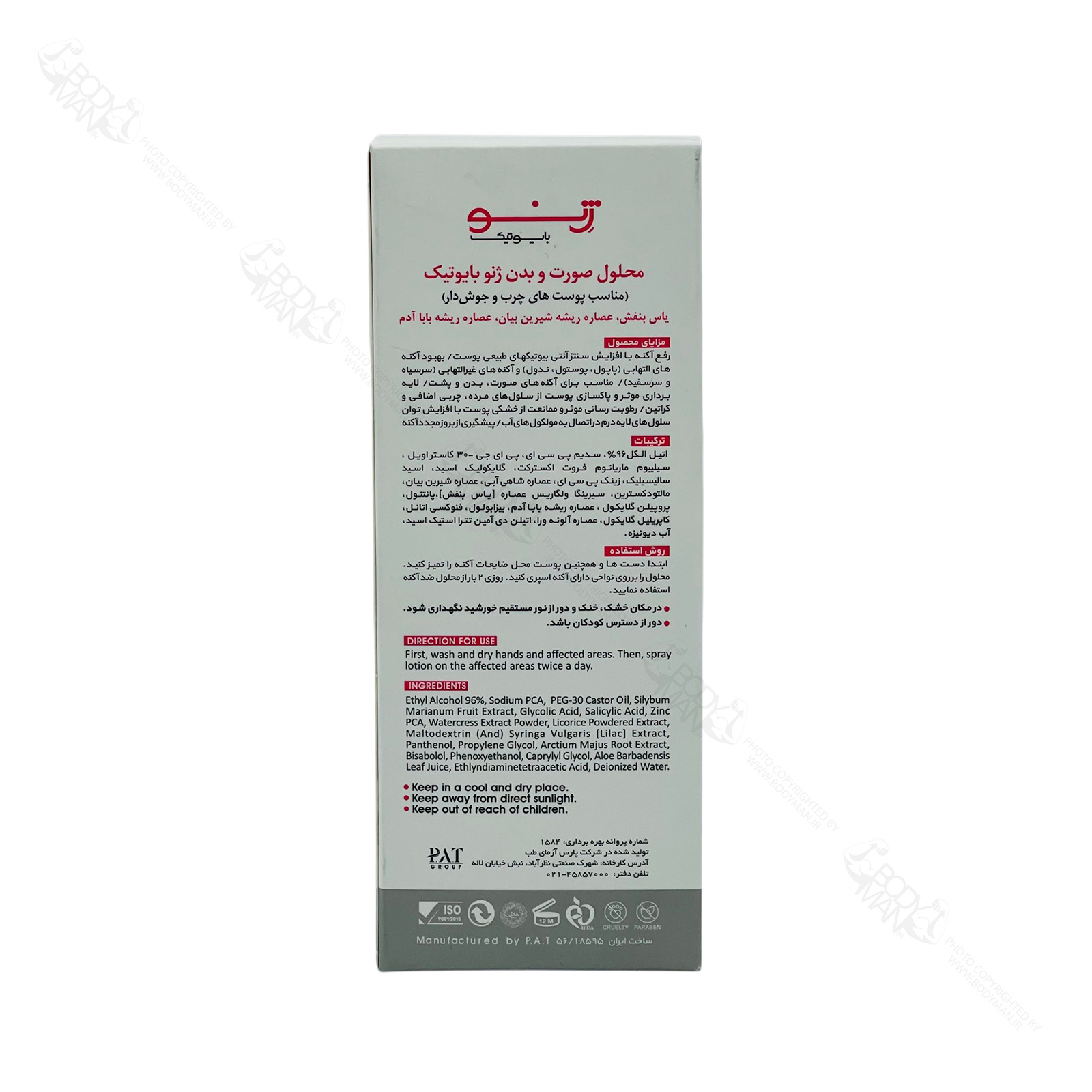- درمان تخصصی آکنه بدن: فرموله شده برای رفع جوشهای نواحی مختلف بدن مانند کمر، بازو، شانه و سینه.